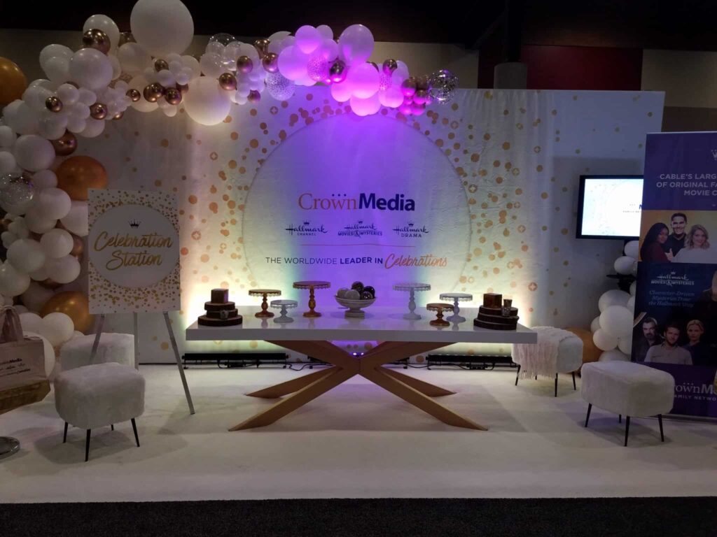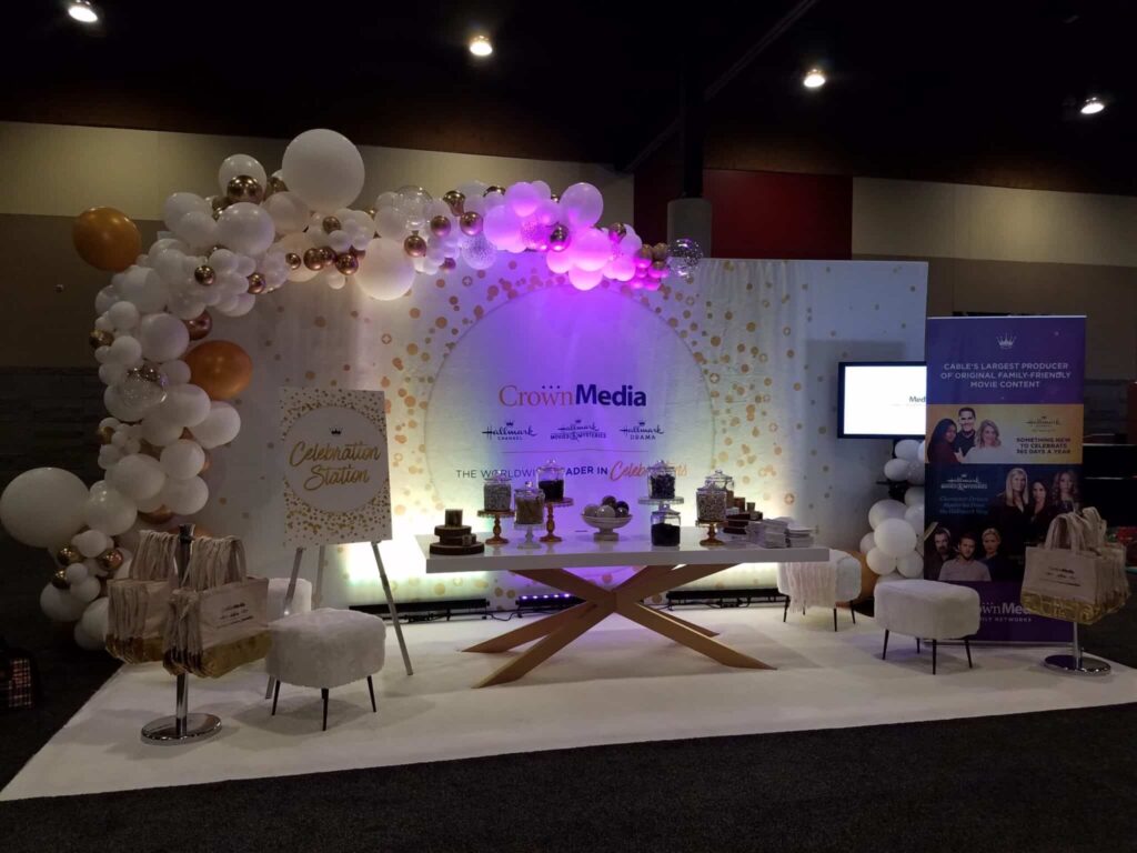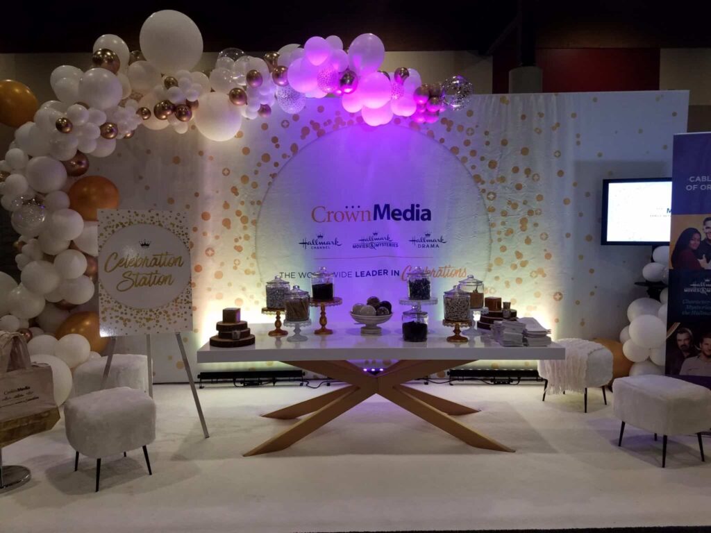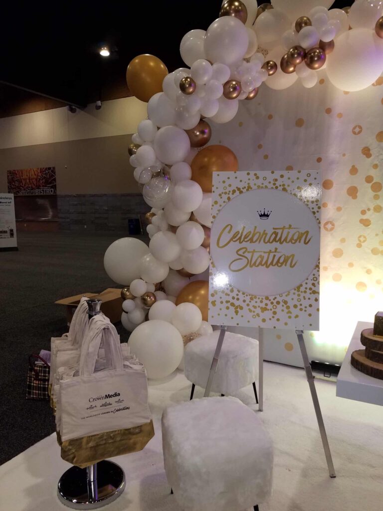 Part 2 not a ball pit!!! view from above – Hundreds of 11” and 3’ balloons overhead on a net above a long walkway set with tables #balloonfairies at work!!!